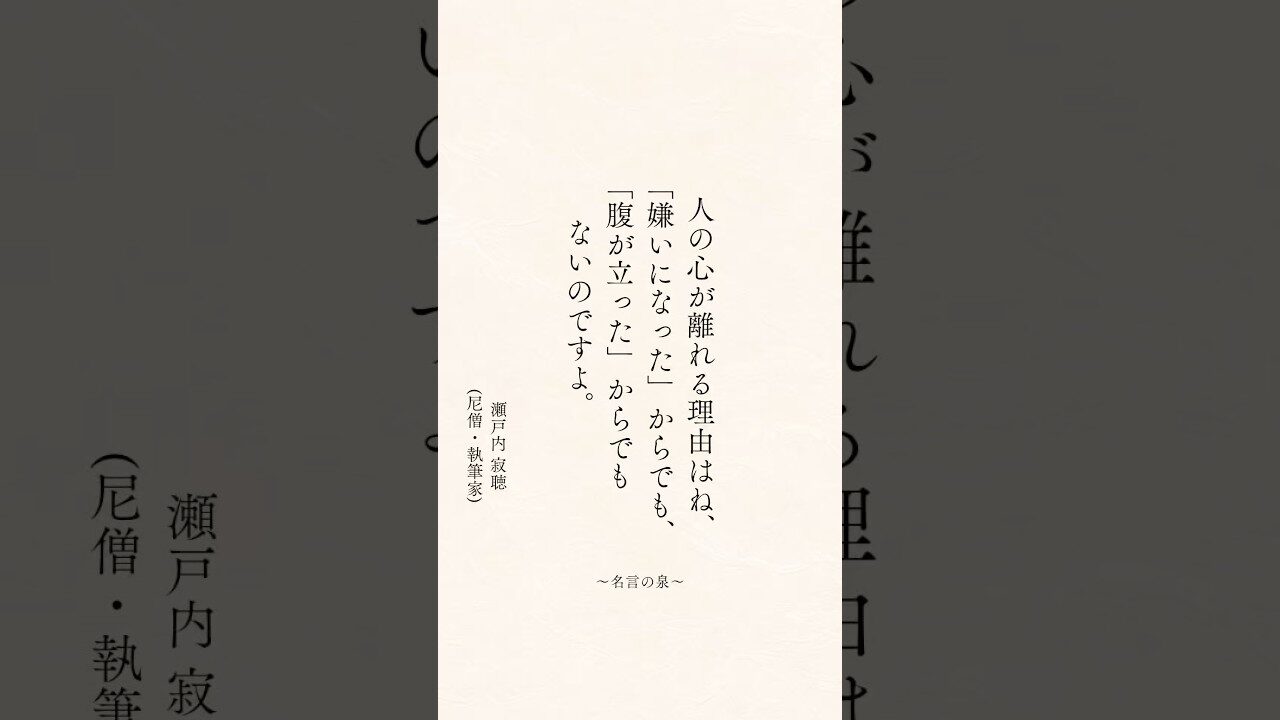 心に染みる名言 瀬戸内寂聴(尼僧・執筆家)の名言 #心に響く言葉 #心に刺さる言葉 心に染みる名言 2026年4月26日 この動画では|今回ご紹介するのは、瀬戸内寂聴(尼僧・執筆家)の名言 #心に響く言葉 #心に刺さる言葉 です。 心に染みる名言 定期的に名言が受け取れるLINEはこちら! コロナ禍で気分が落ち込んだり、元気になれない時が多くなってませんか?このLINEで名言を定期的に見て、気分を上げていきましょう。人生をパッと明るくする名言や、お金に関する格言などを無料で受け取れます。